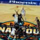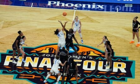 UCLA center Lauren Betts (51) and South Carolina center Madina Okot (11) battle for a tip-off during the first half of the...