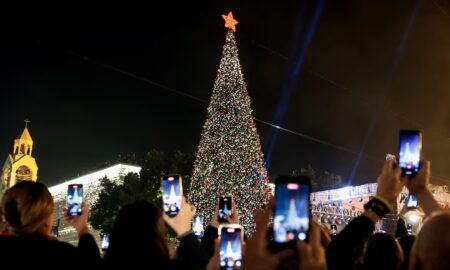 Hundreds of people gathered in Bethlehem’s Manger Square to watch the lighting of a Christmas tree, two years after all public celebrations...