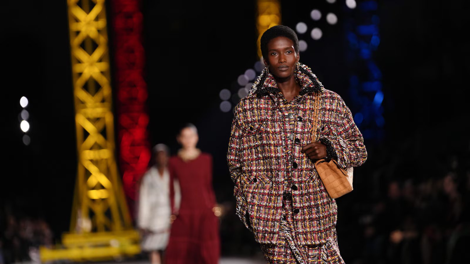 The final stretch answered that concern with force. Sequined plaid suits arrived in dazzling color. Beaded coats glinted with star-chart embroidery.