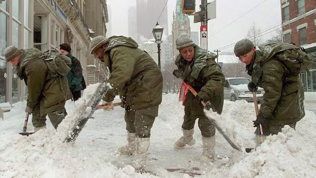 That day, as a storm dropped more snow on the city, 400 soldiers arrived from Petawawa to help with snow removal. Toronto mayor Mel Lastman had called them in, drawing ridicule from many people in other cities across wintry Canada.