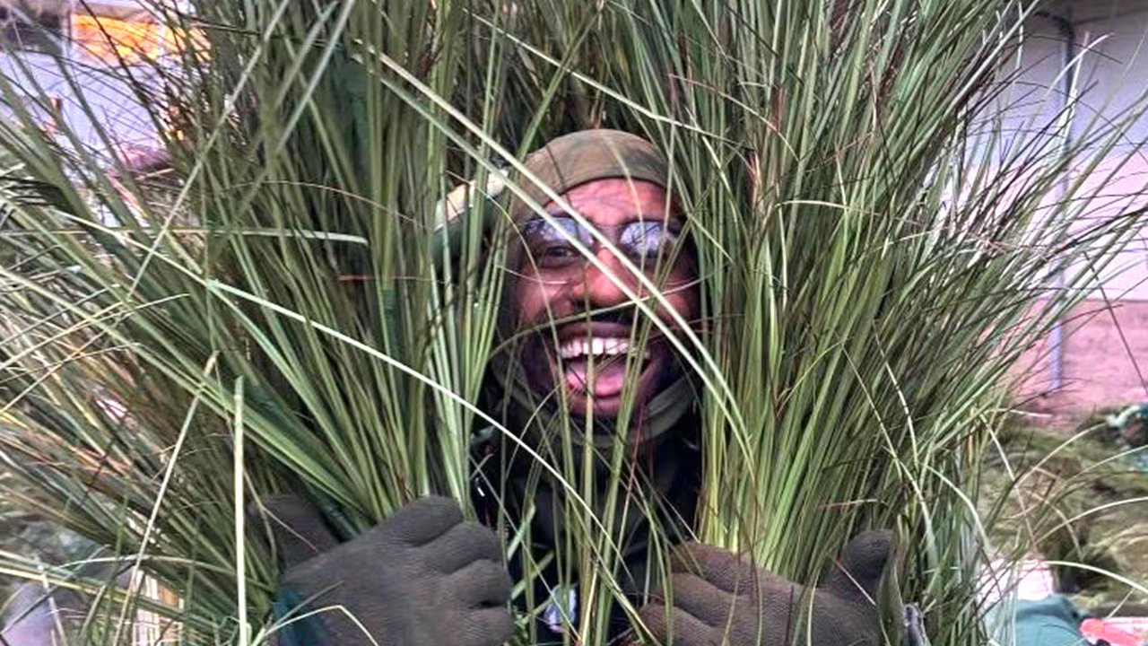 a man smiles behind reeds of tall grass