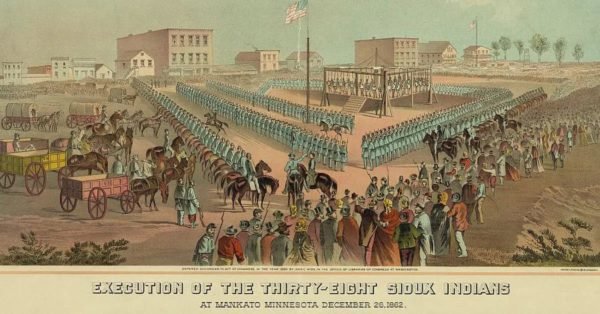The execution happened in Mankato, Minnesota, in front of some 4,000 spectators. Some historical accounts say that the men held hands and sang a traditional Dakota song in the moments leading up to their deaths.
