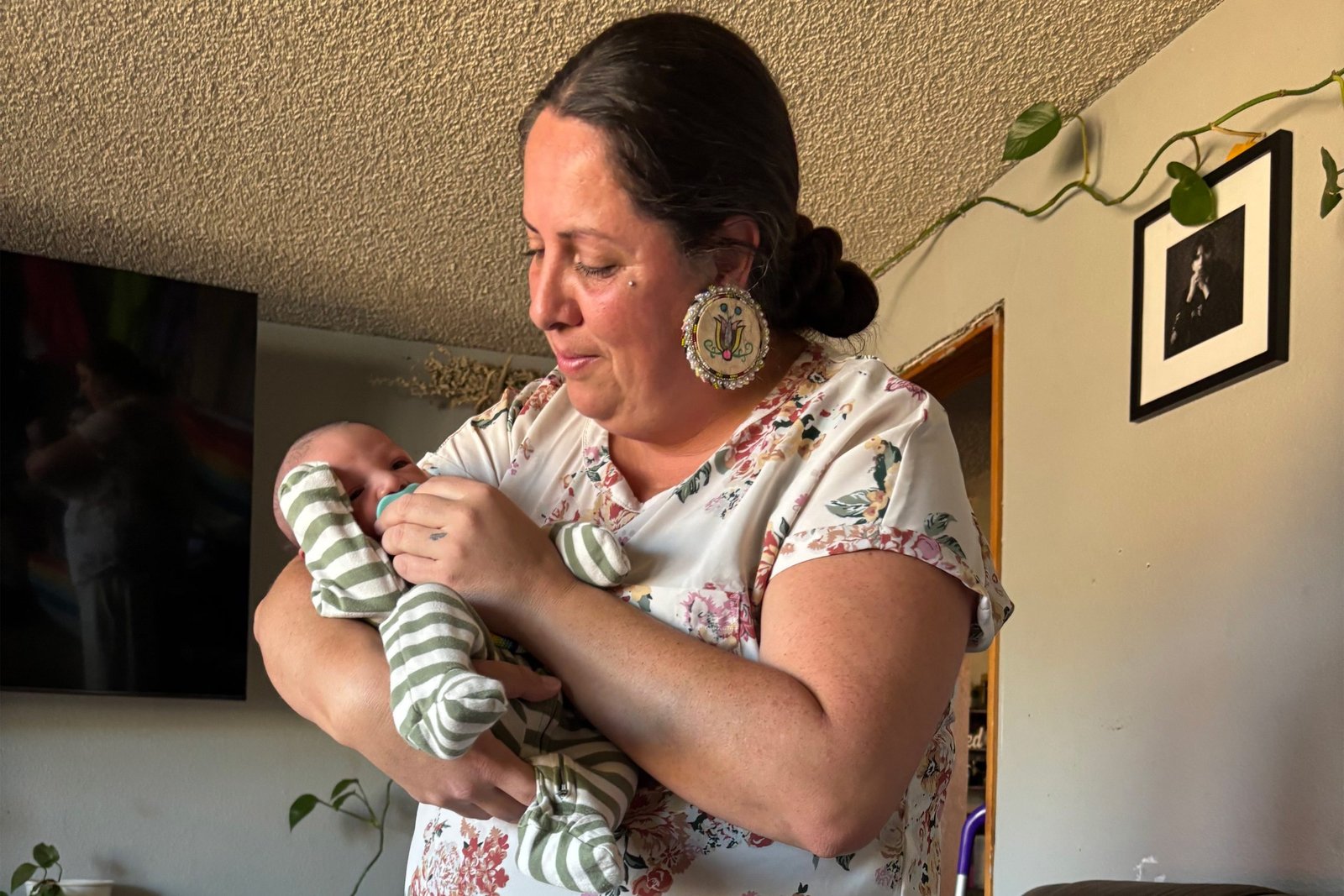 A mom of seven, Pipe is a doula on the reservation who supports new and expectant parents. She does that work free, around her day job. That’s because in this town of about 2,000 people, the closest hospital that delivers babies is 100 miles away.